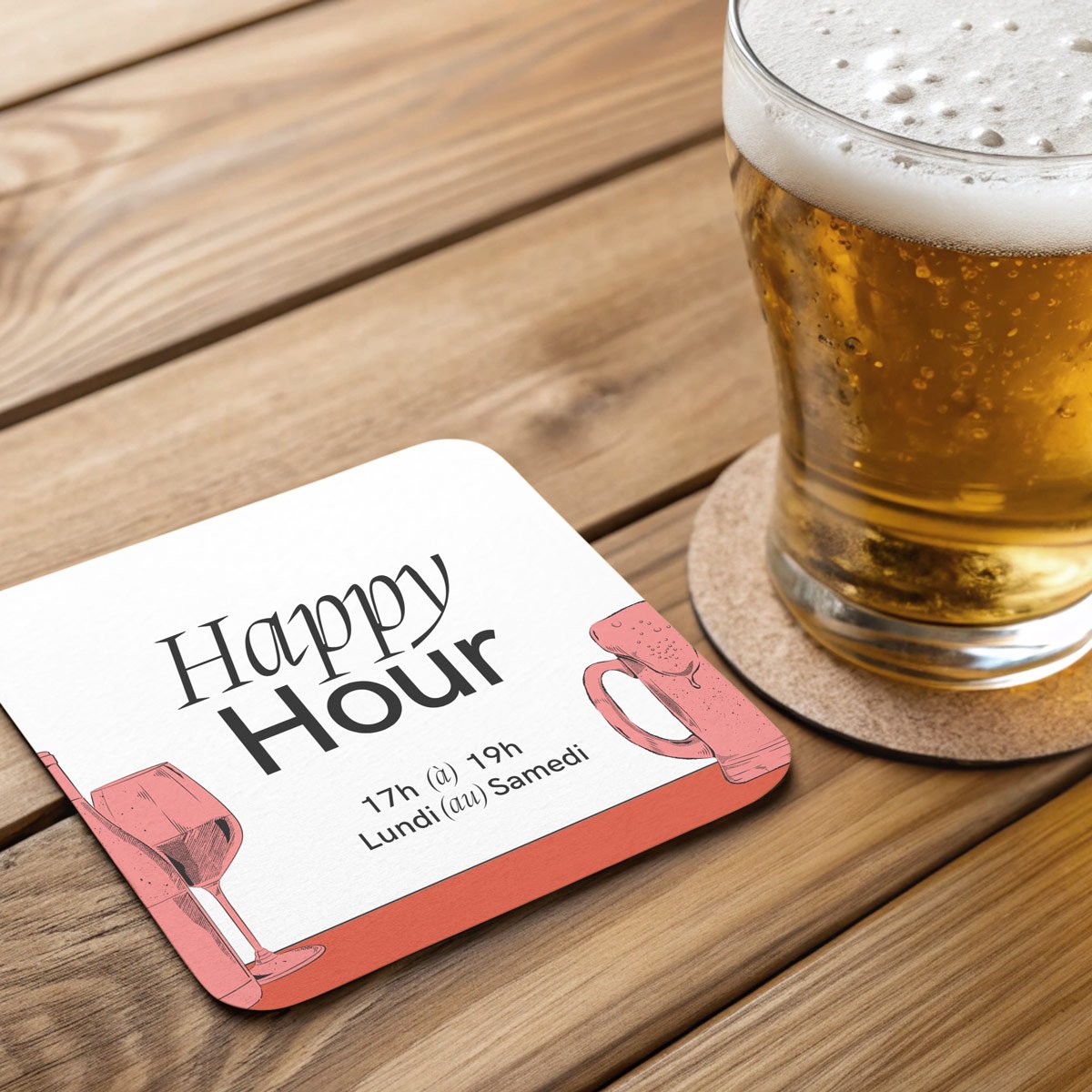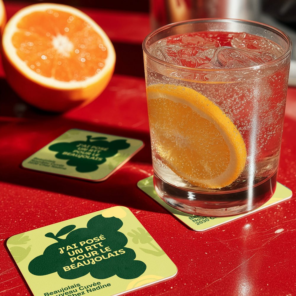 Sous-verres personnalisés imprimés en haute qualité. Disponibles en format carré ou rond, idéals pour bars, restaurants et événements.